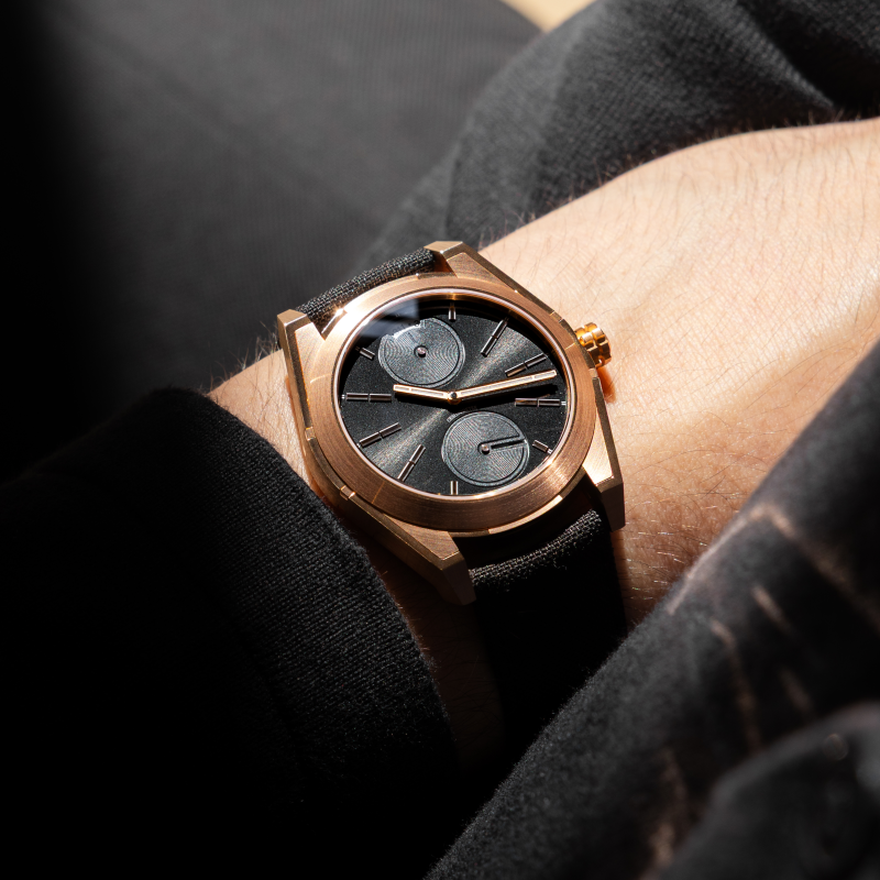 Automatic Certified Chronometer (ISO 3159) movement with hours, minutes, seconds (6 o’clock disk), and date (12 o’clock) displays. Features variable inertia balance and 100% recycled titanium bridges and plates.