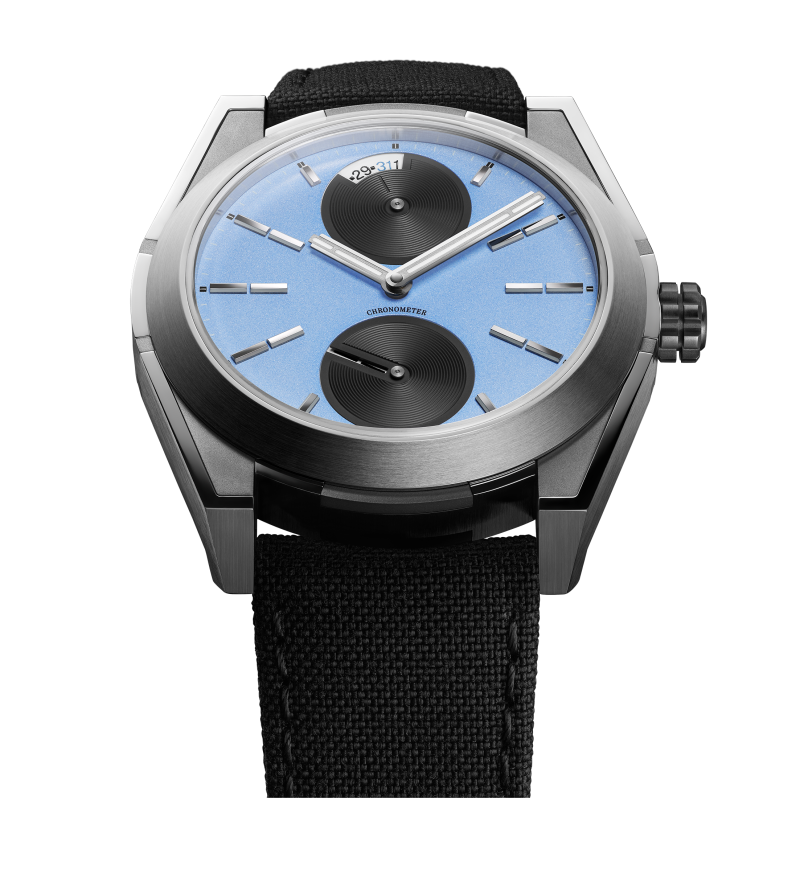 Automatic Certified Chronometer (ISO 3159) movement with hours, minutes, seconds (6 o’clock disk), and date (12 o’clock) displays. Features variable inertia balance and 100% recycled titanium bridges and plates.