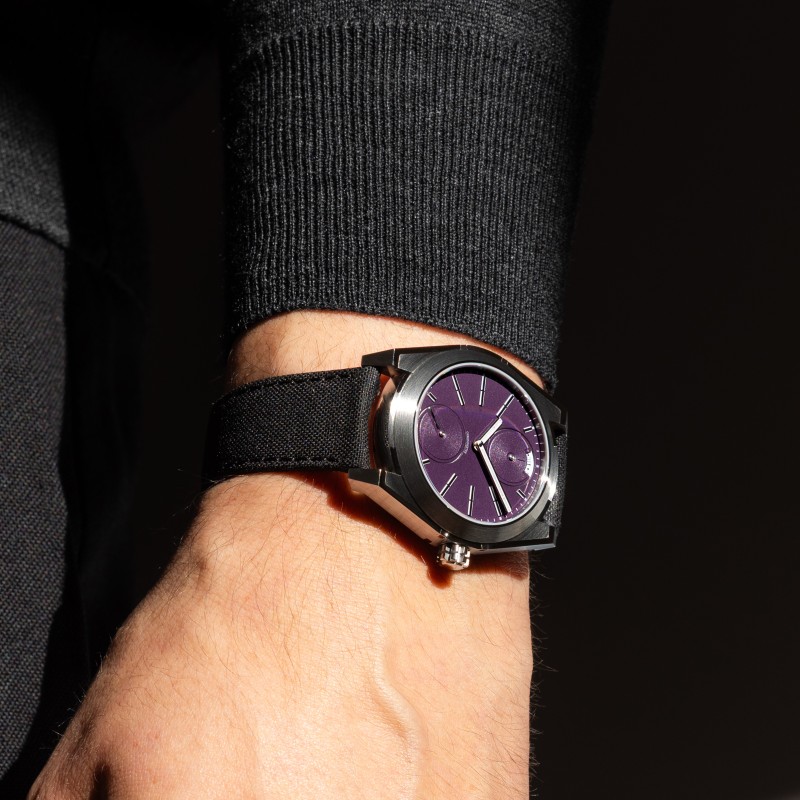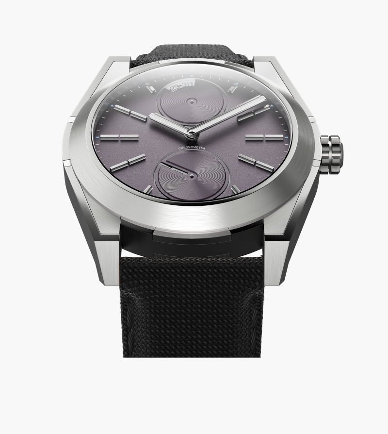 Automatic Certified Chronometer (ISO 3159) movement with hours, minutes, seconds (6 o’clock disk), and date (12 o’clock) displays. Features variable inertia balance and 100% recycled titanium bridges and plates.